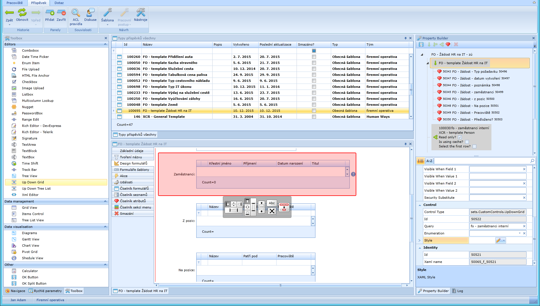 Jestliže uživatel má dostatek práv, může si otevřít předpis příspěvku, tzv. šablonu a ihned provádět změny nastavení.