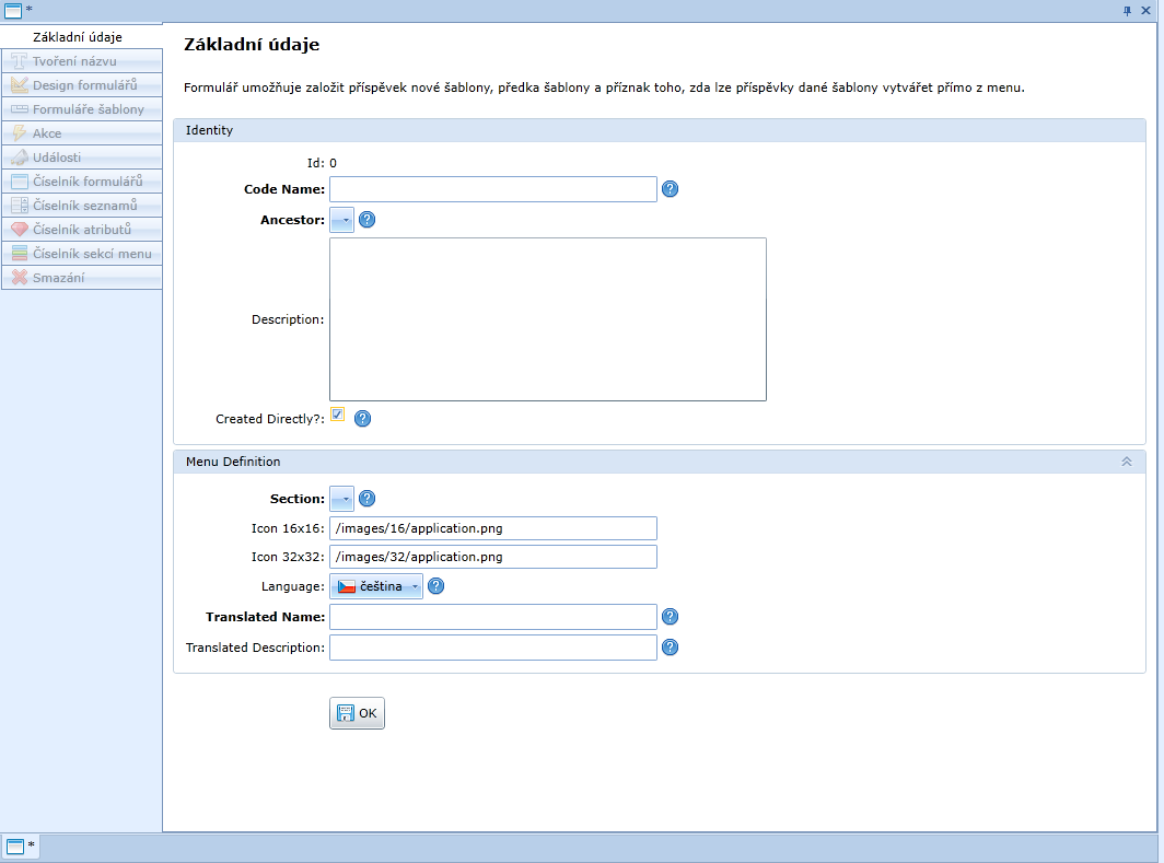 Otevře se formulář Základní údaje nové šablony.