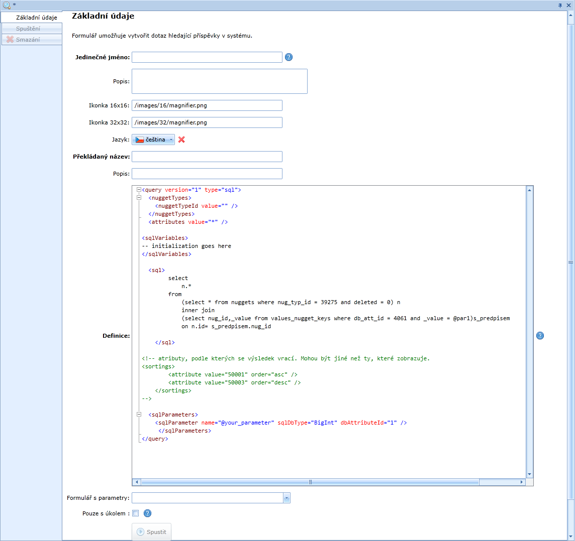 sqlParameters – Parametry. Používá se pouze v případě, že je dotaz použit v kontextu typu formuláře. Parametr získává svoji hodnotu z kolonky