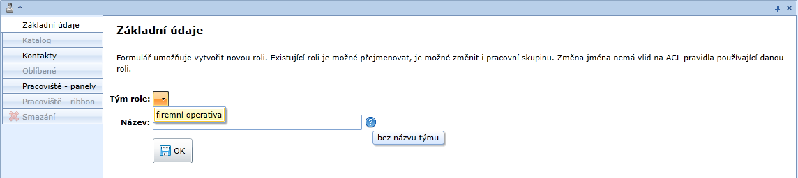 Formulář umožňuje vytvořit novou roli. V rámci vybraného týmu musí být název role jedinečný. Změna názvu role nemá vliv. ACL pravidla s danou rolí budou