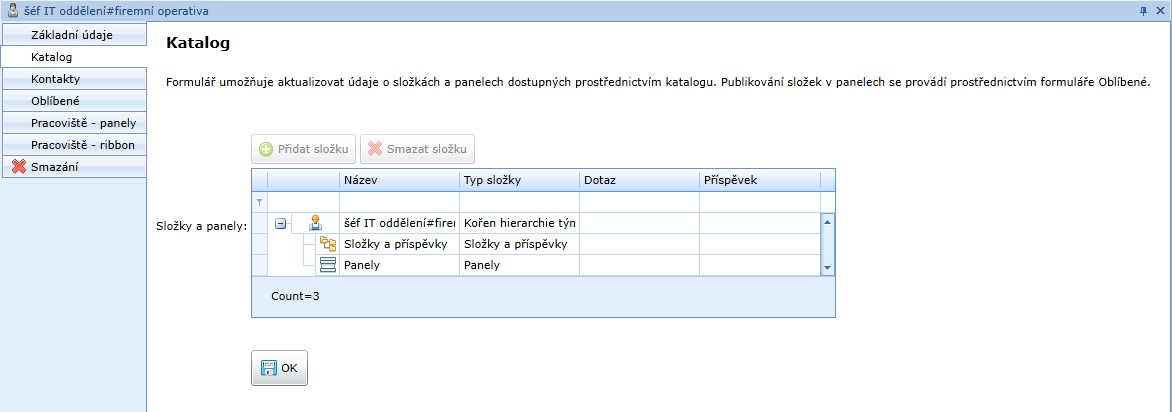 Formulář umožňuje nastavit složky a panely, které mají mít uživatelé s danou rolí k dispozici.
