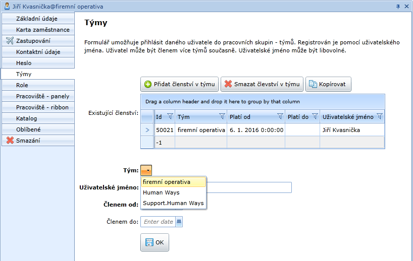 Pouze osoba, která má přiděleno členství v týmu, nadefinované uživatelské jméno a heslo se může přihlásit do systému.