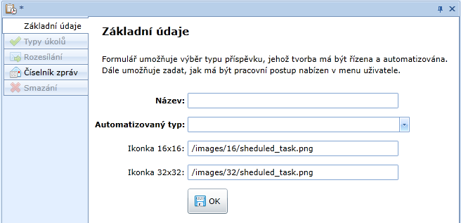 Formulář umožňuje výběr typu příspěvku, jehož tvorba má být řízena a automatizována.