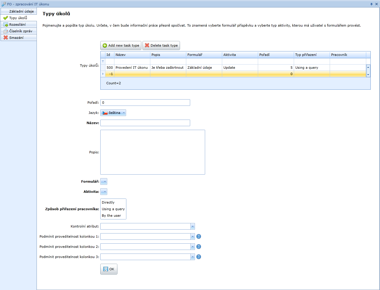 Typy úkolů – kolonka umožňuje aktualizovat úkoly.