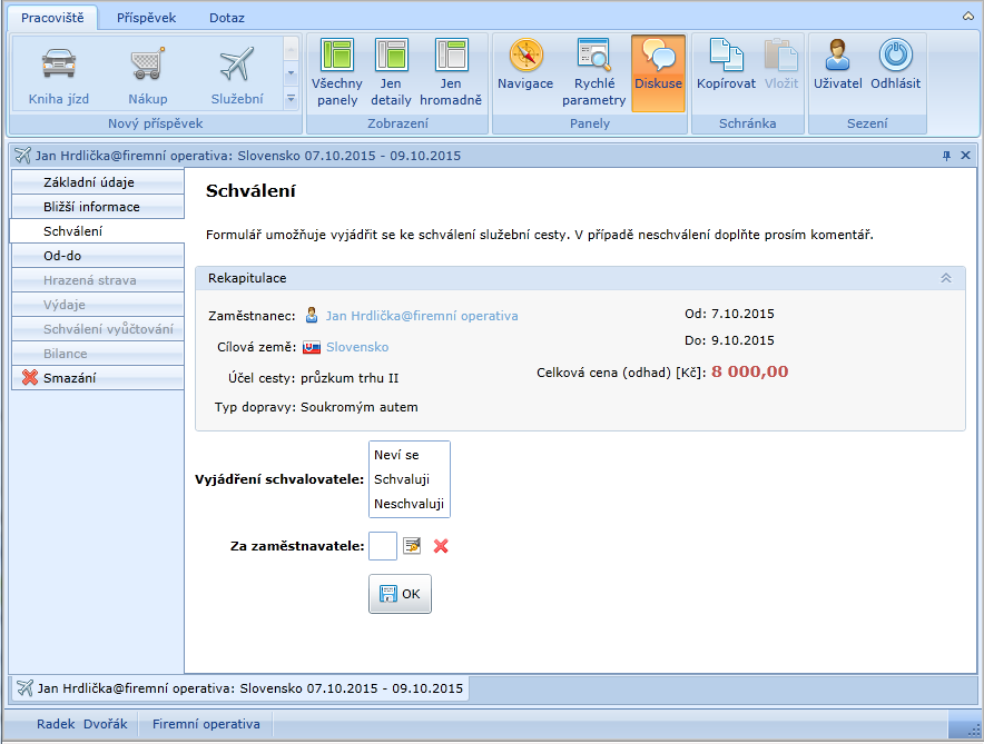 Schválení služební cesty provádí uživatel radek dvořák@firemní operativa (1234) a splnit úkol tím, že se vyplní kolonky Vyjádření schvalovatele.