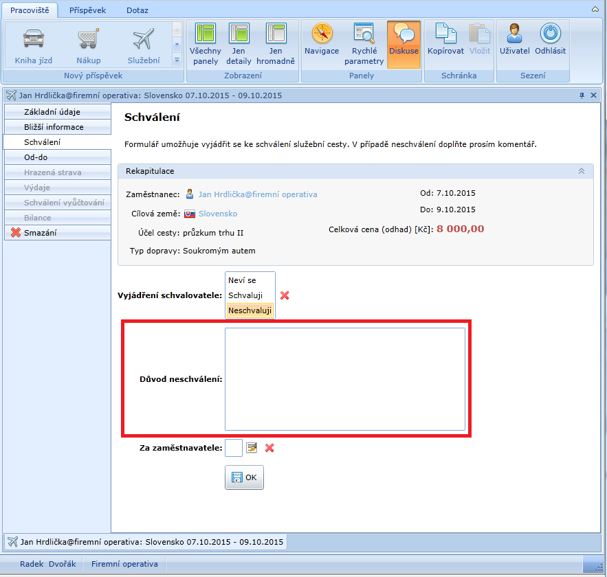 V případě, že schvalovatel odmítne služební cestu schválit, musí vyplnit důvod: