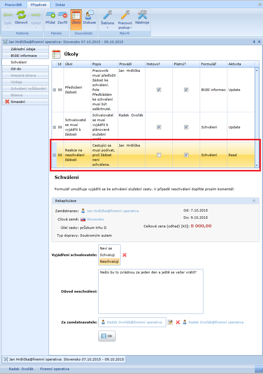 V případě neschválení dostane úkol cestující. Musí se podívat na formulář Schválení, protože tam je uveden důvod.