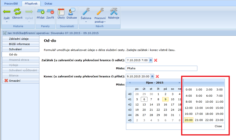 Na formuláři „Od-do“ je třeba věnovat pozornost zadaným časům začátku a konce cesty: