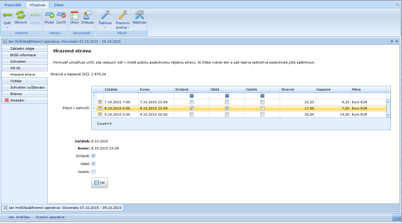 Uložením dojde ihned k přepočtu stravného a kapesného jednotlivých cestovních dnů i pro služební cestu jako celku. Pro každý den je uvedena výše stravného,