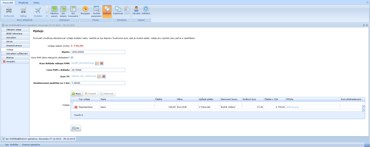 služební cesty. Jsou dostupné přílohy s naskenovanými doklady.