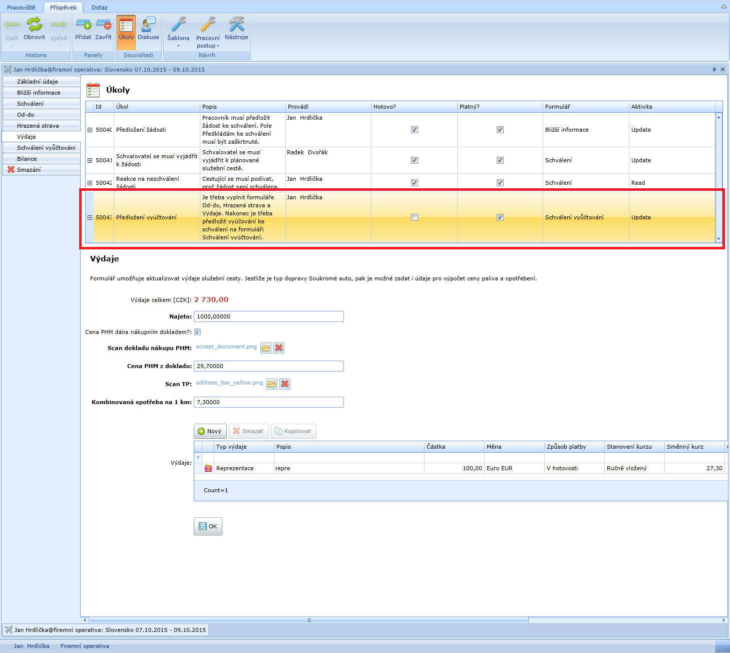 Jakmile cestující zapíše veškeré výdaje, může splnit svůj úkol tím, že vyúčtování předloží ke schválení.