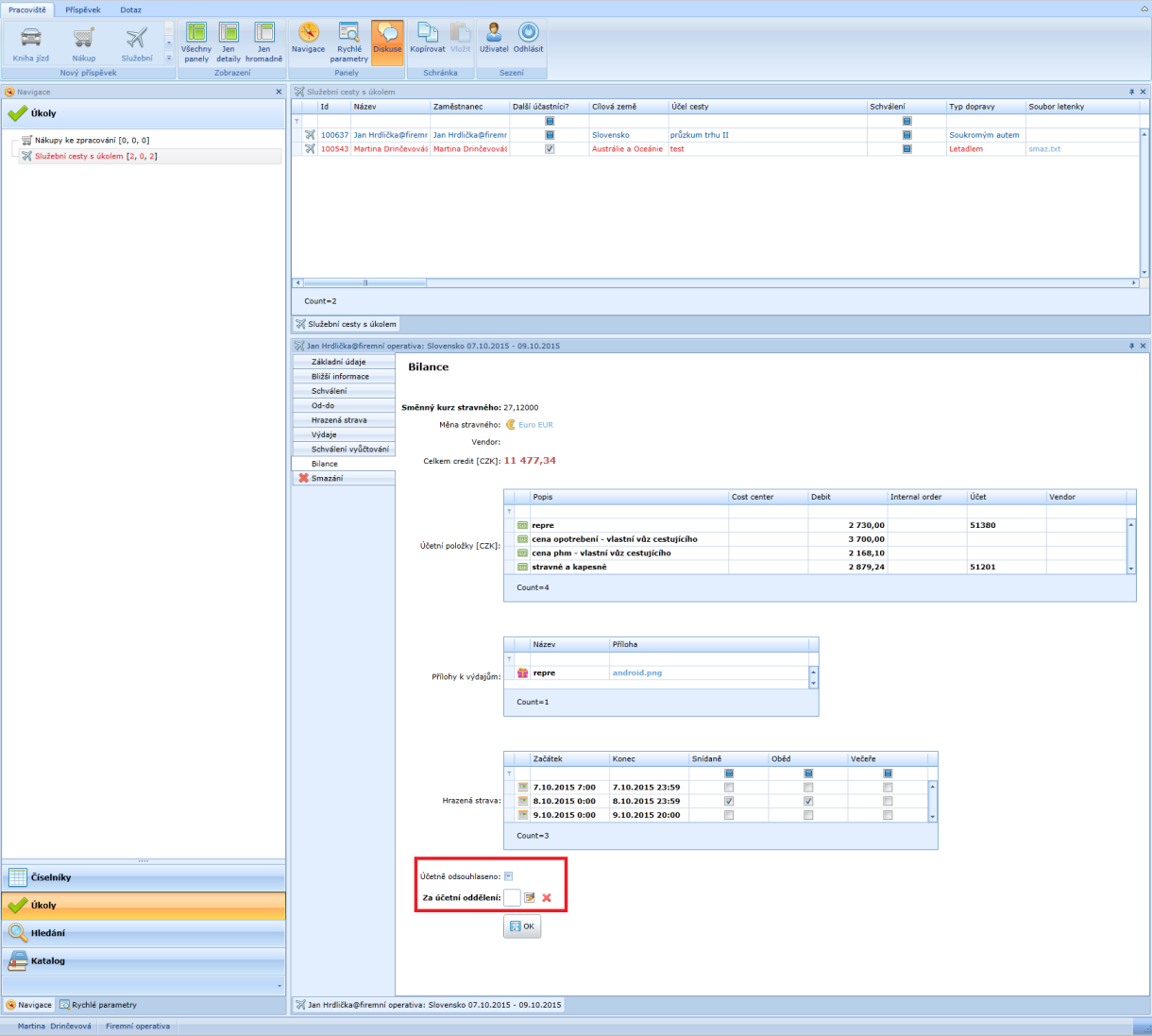 Tuto žádanku je možné následně schválit, zadat délku trvání cesty, hrazenou stravu, výdaje učiněné na služební cestě a i proplacení výdajů následně schválit. Zpracování je uzavřené schválením rolí Účetní.