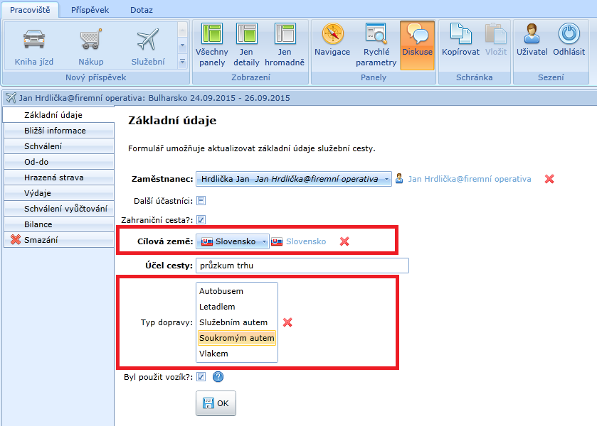 Na základních údajích můžete určit, zda se jedná o cestu tuzemskou nebo zahraniční. Jestliže vyberete typ dopravy Soukromé auto, bude možné zadat ujeté kilometry pro výpočet náhrad za palivo a opotřebení auta.
