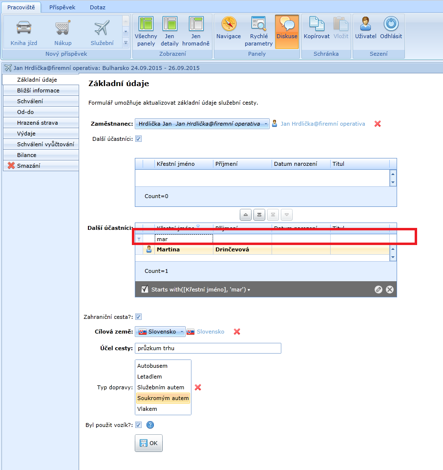 Jestliže zaškrtenete, že na služební cestu pojede více účastníků, objeví se další kolonka. Spodní tabulka v této kolonce nabízí všechny zaměstnance, vrchní