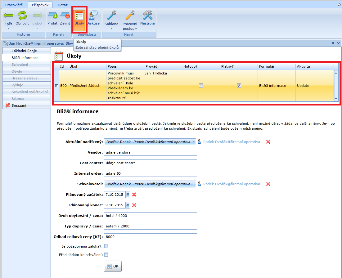 Stav pracovního postupu konkrétní služební cesty lze zobrazit pomocí přepínače Úkoly v na kartě Příspěvek v pásu karet (Ribbon).